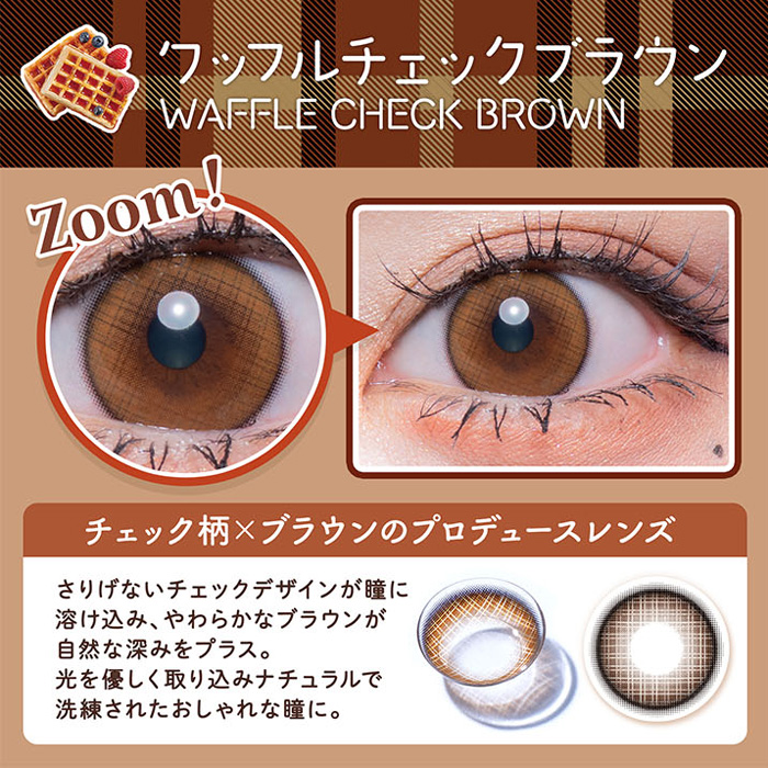 さりげないチェックデザインが瞳に溶け込み、やわらかなブラウンが自然な深みをプラス。