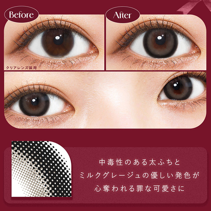中毒性のある太ふちとミルクグレージュの優しい発色が心奪われる罪な可愛さに。