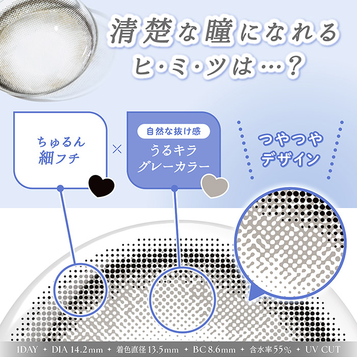 どんな瞳の色(黒色・茶目)でもナチュラルに光をとりこみ、うるっと奥行きのある瞳。