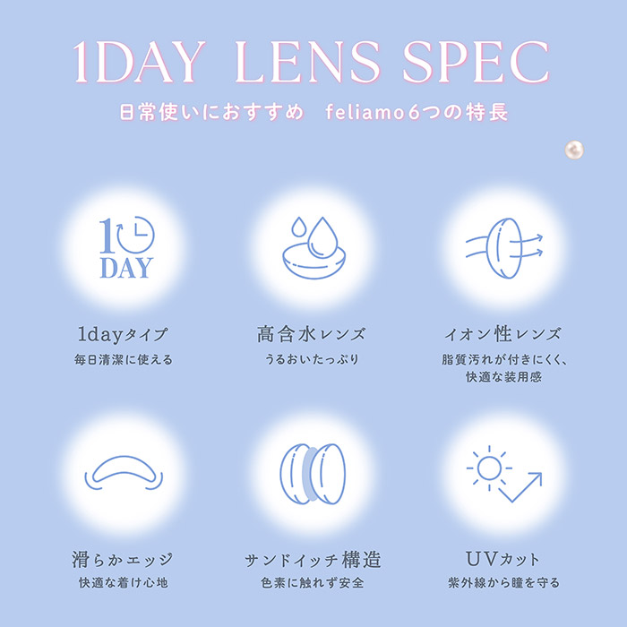 feliamoの由来は「felice amore ~幸せな愛~」。瞳から愛されオーラを放つ好印象レンズで女性らしさと品を演出。オンも、オフも、特別な日も。どんな場面にも溶け込むレンズラインナップで誰からも愛される瞳に。