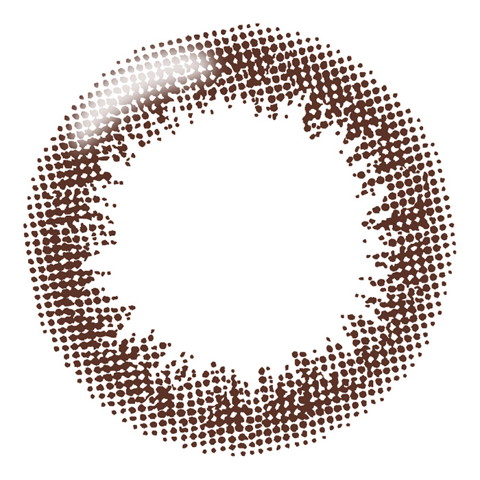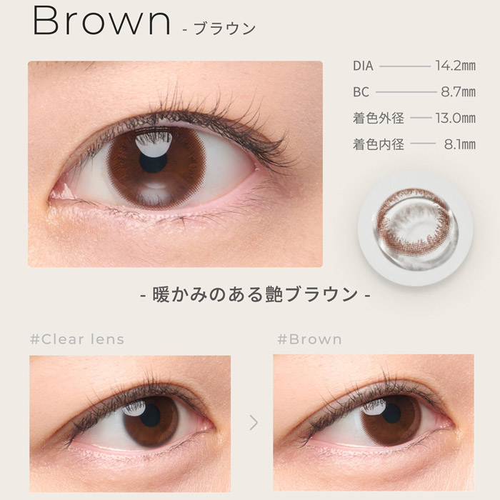 少し赤みのあるブラウンはツヤツヤと明るく発色。やわらかで優しさを纏う瞳に。