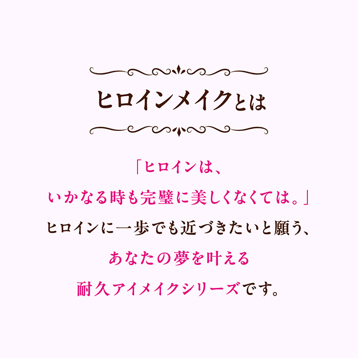 ヒロインメイクとは「ヒロインは、いかなる時も完璧に美しくなくては。」ヒロインに一歩でも近づきたいと願う、あなたの夢を叶える耐久アイメイクシリーズです。