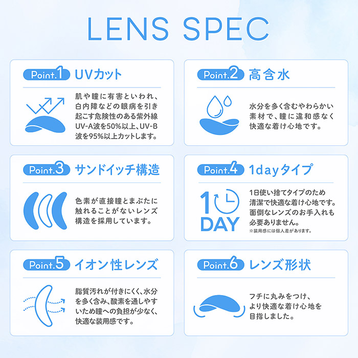 | 使用期間 | 1日使い捨て(ワンデー、1day) |