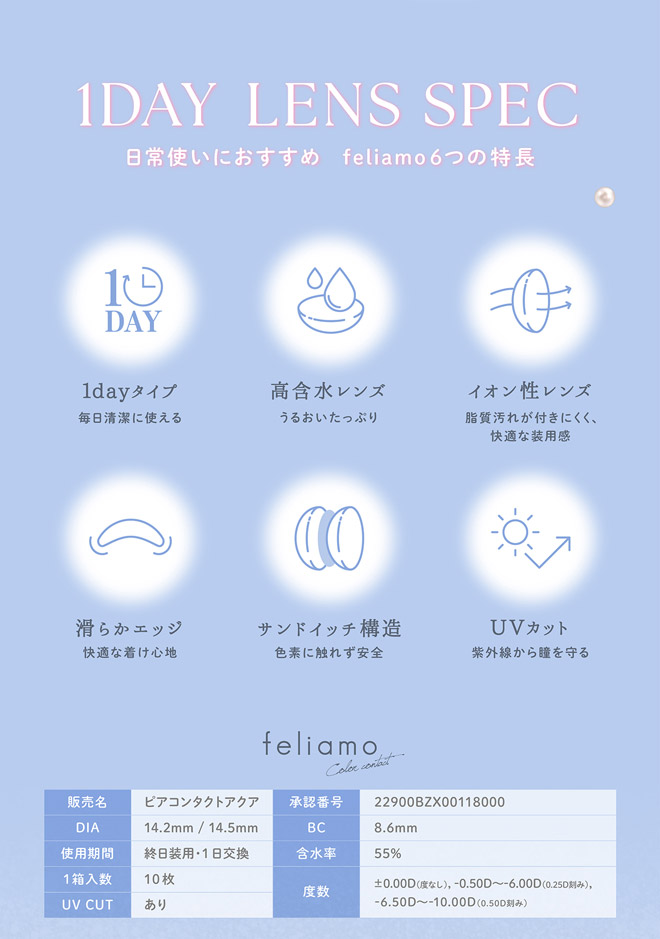 feliamoの由来は「felice amore ~幸せな愛~」。瞳から愛されオーラを放つ好印象レンズで女性らしさと品を演出。オンも、オフも、特別な日も。どんな場面にも溶け込むレンズラインナップで誰からも愛される瞳に。