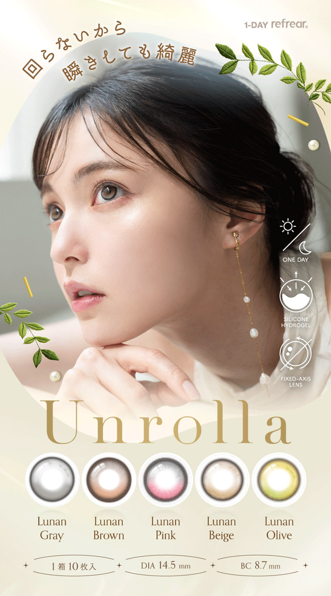 坂巻有紗イメージモデルのワンデーカラコン「アンローラ(Unrolla)」。シリコーンハイドロゲル素材&モイスチャーのハイライトで回らない水光デザイン!裸眼のようなつけごこちの次世代カラコン。「Unrolla」はずっと盛れて、ずっと心地いい!安心のサンドイッチ構造。